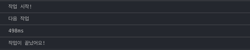 결과물을 보면, 작업이 시작 되고 나서, for 루프가 돌아가는 동안 다음 작업도 실행되고, for 루프가 끝나고 나서 몇 ms 걸렸는지 나타나고 있습니다.